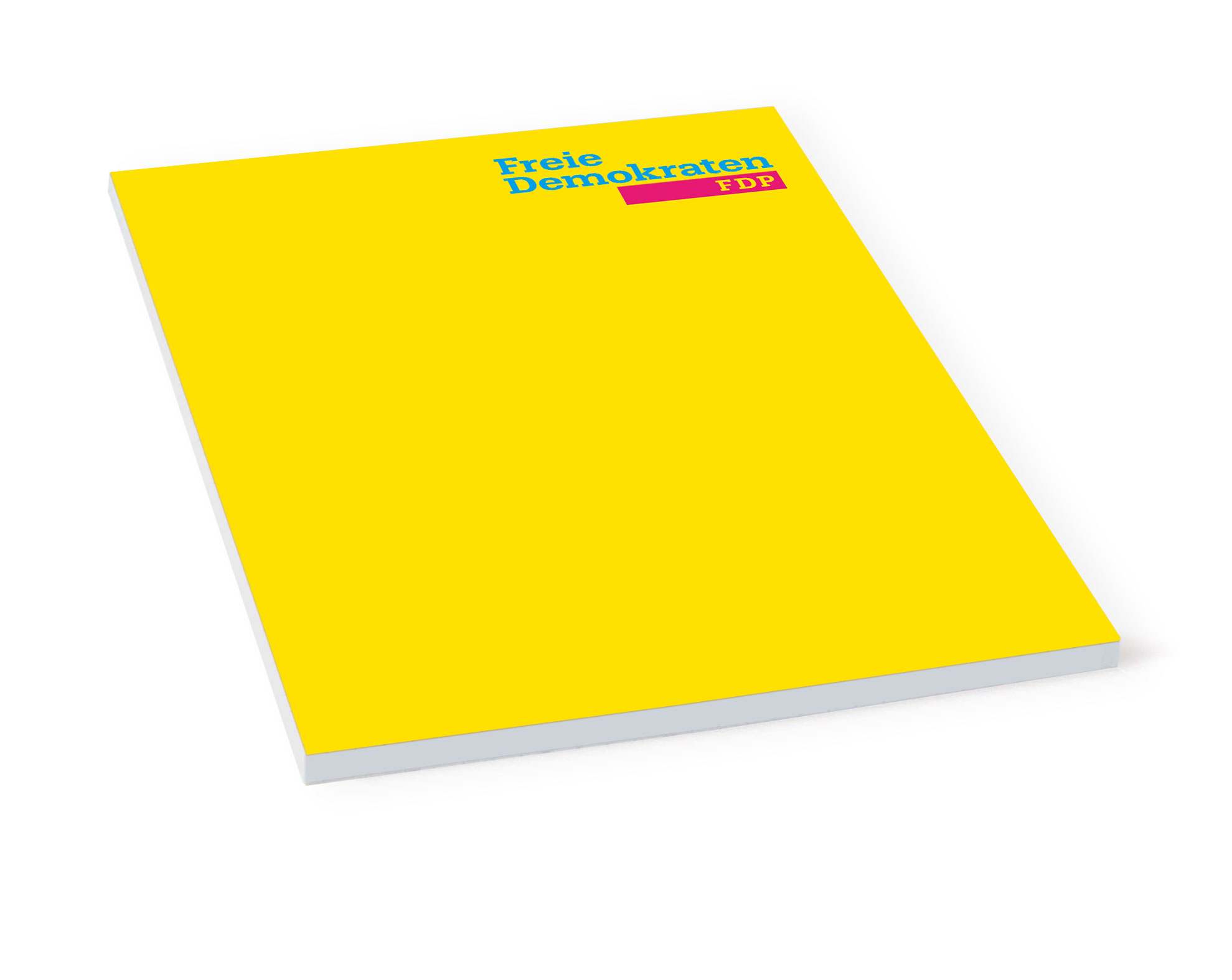 DIN A5 Notizblock mit Deckblatt (gelb mit FDP-Logo). Innen 25 unbedruckte, weiße Seiten, oben gebunden.