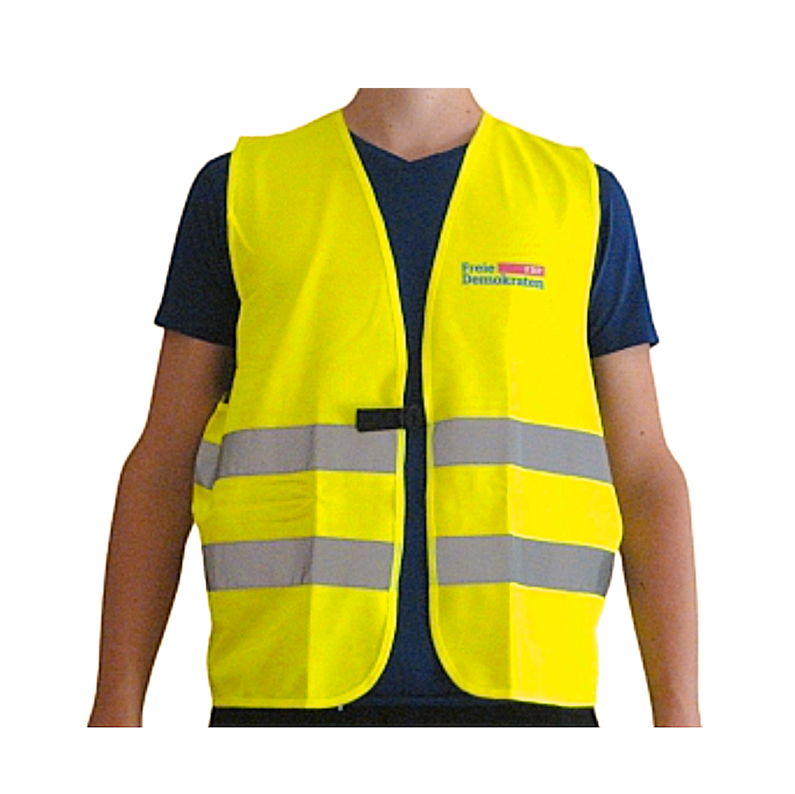 entspricht DIN NORM EN 471, neon-gelb, breite Rückstrahlbänder, mit 3-farb.FDP-Logo herzseitig, Einheitsgröße