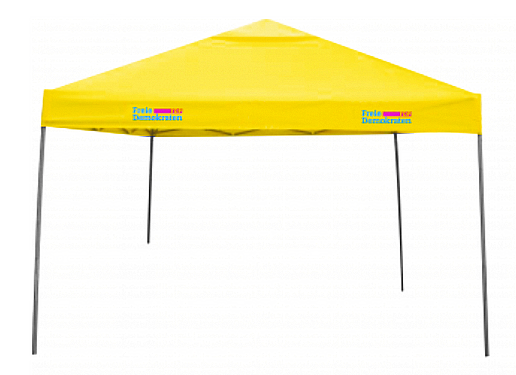 Alu-Scheren-Pavillon 3 x 3 x 2 m, mit höhenverstellbaren Standbeinen, gelbe Polyesterbespannung mit Volants incl. FDP-Logo in cyan und magenta, incl. Transporttasche, incl. Bodenbefestigungshaken Aufbau in ca. 2 min. möglich! Größe verpackt: 150x24x24cm, Gewicht = 20 Kg, Abbildung ähnlich.