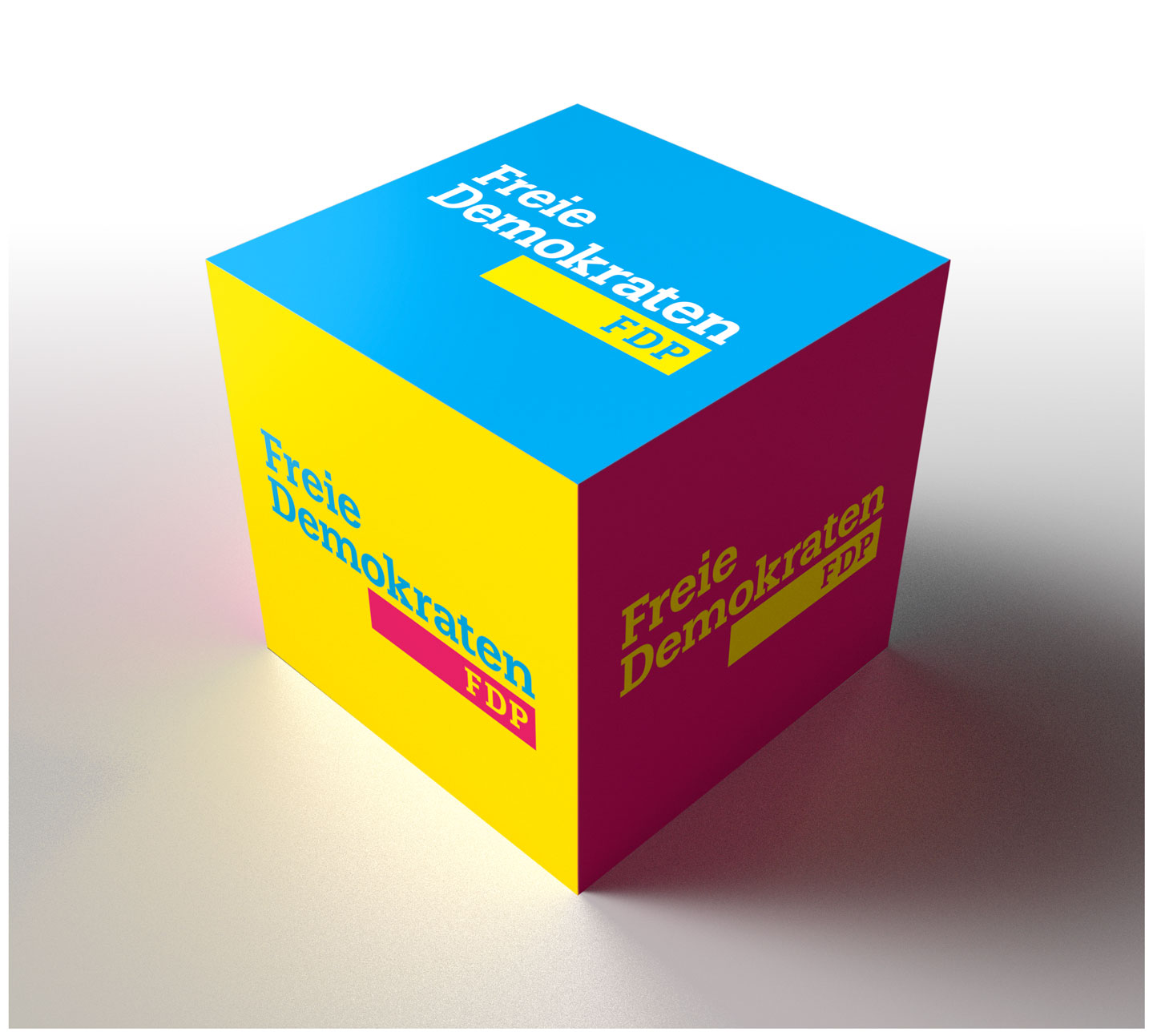 Sitzwürfel 45 cm, mit waschbarem Bezug (maximal 30° im Schonwaschgang), Kern-Qualität RG 40/65, PUR-Schaumstoffkern, Bezug 220g Polyester-Gewebe. Farbigkeit: vorne und hinten gelb, links und rechts magenta, oben und unten cyan, jeweils mit FDP-Logo