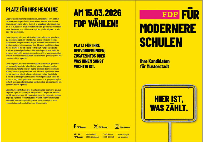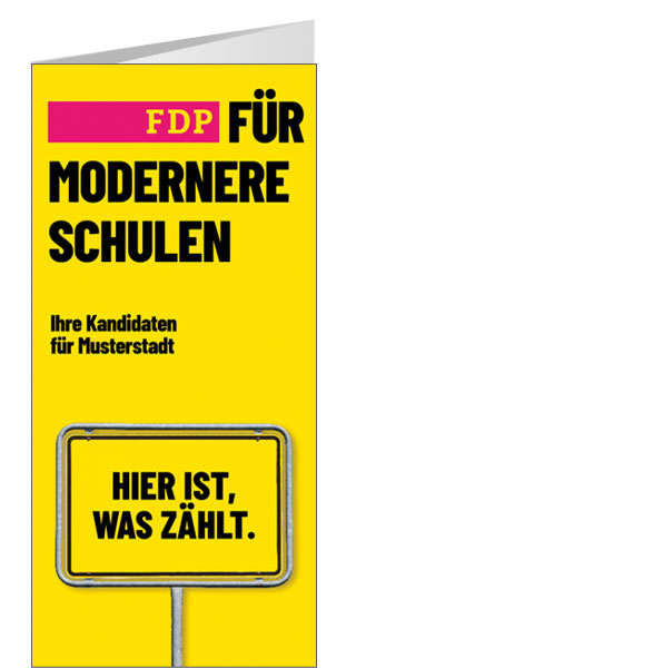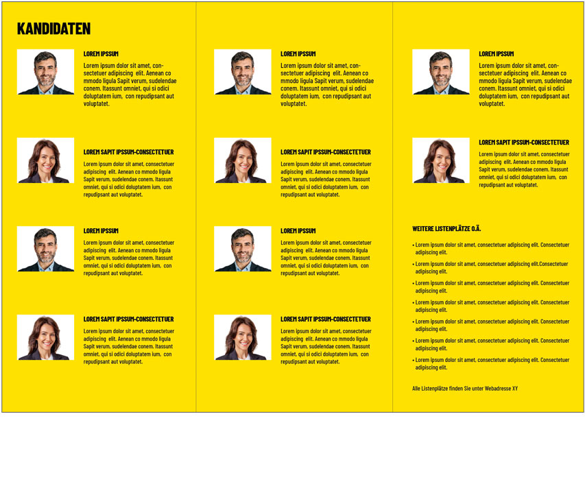 Kandidatenflyer für Teams 6 Seiten im Format DIN lang, gedruckt auf 135g Bilderdruck, matt. Individualisierbar (pro Spalte nicht mehr als 1200 Zeichen plus Headlines). Platzierung des bereits bearbeiteten Kandidatenfotos und Einbau der individualisierten Texte. Sie schicken uns einfach Ihre Texte und Bilder, wir übernehmen die Layoutarbeiten für Sie. Sie erhalten innerhalb von 1-2 Arbeitstagen eine Freigabe-PDF. * Bitte Textdatei und evtl. weitere Fotos beilegen (bei mehreren Dateien als ZIP).