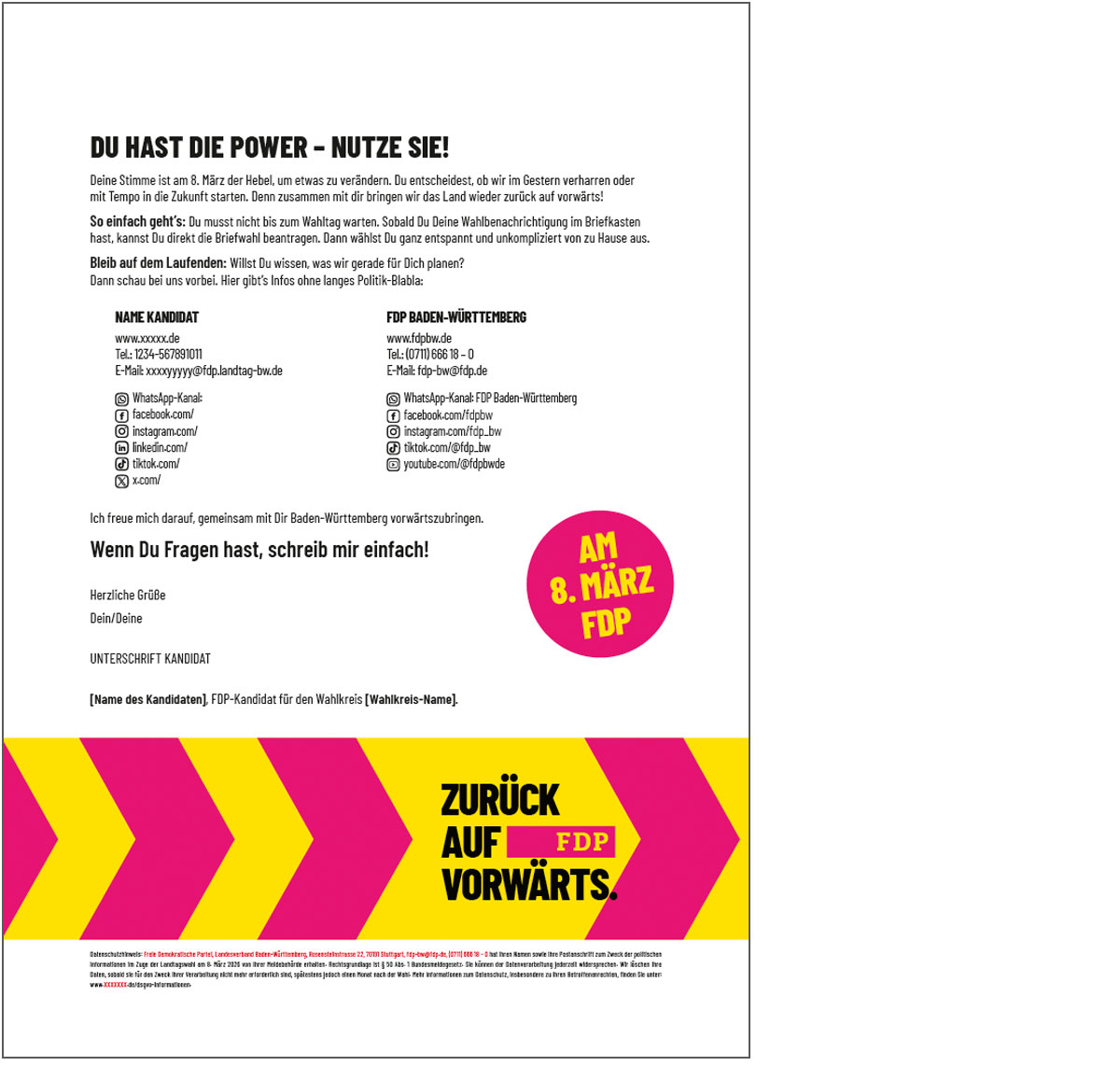 Mit diesem Brief erreichen Sie die Erstwähler in Ihrem Wahlkreis. Bitte fordern Sie die entsprechenden Adressen von der Stadtverwaltung ab.